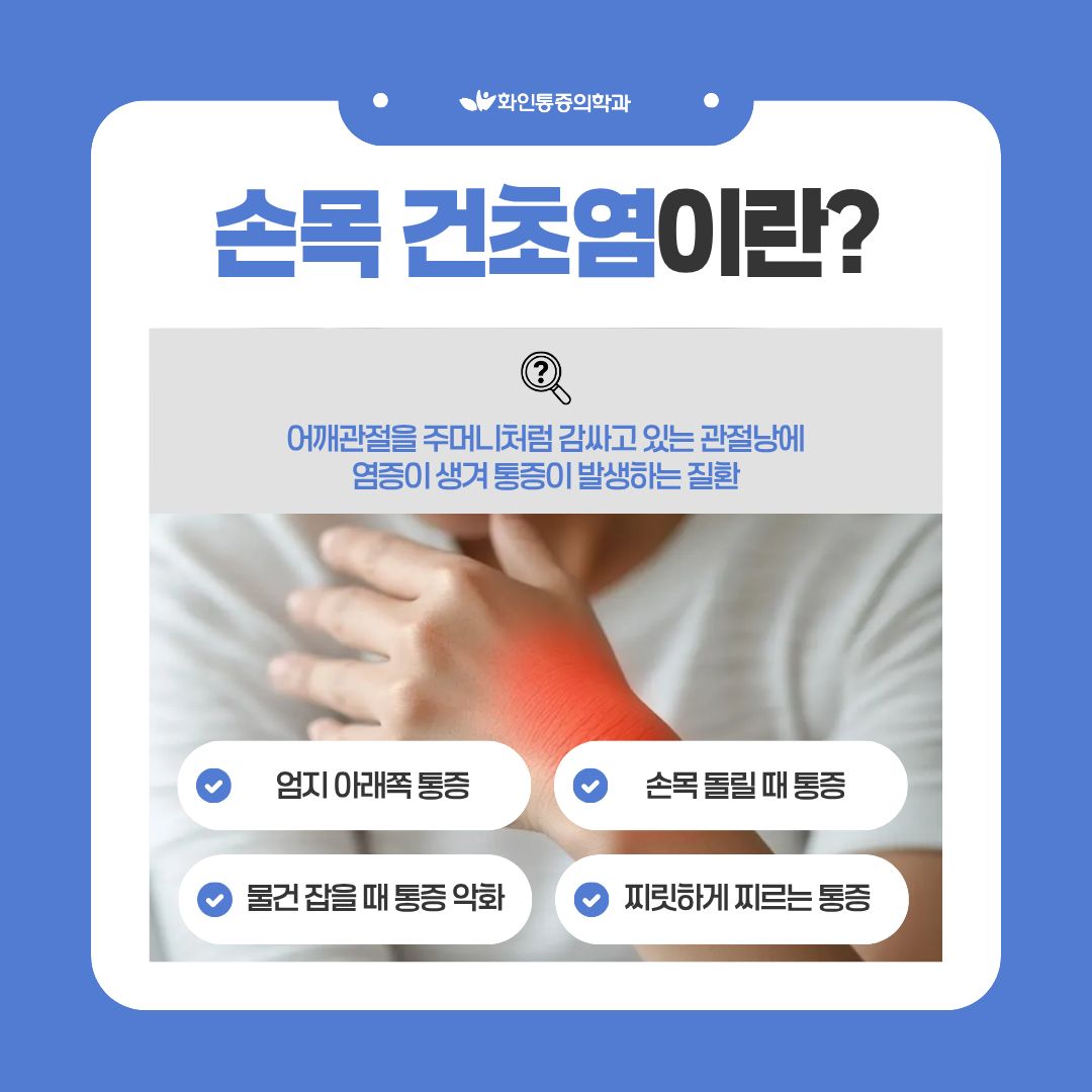 손목 통증, 반복된다면? 손목터널증후군 · 건초염 손목이 보내는 중요한 신호일 수 있습니다. |